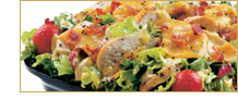 | We run our premium meats, scrumptious cheeses and other tasty toppings through our oven to bring out the flavors. Then we pile them high on a special blend of cool crisp salad greens and top them off with vine-ripened cherry tomatoes and your choice of flavorful dressings - served on the side. Choose from one of our five deliciously different Quiznos Craveable Salads: |